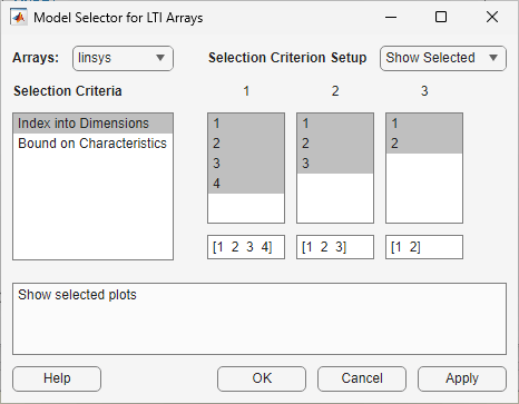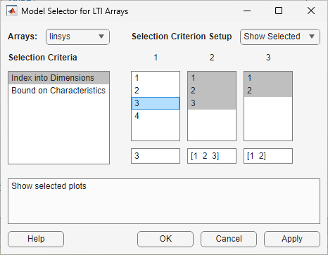The Selection Criterion Setup area contains three columns, one for each model array dimension of linsys. The first column corresponds to the simulation snapshot time. The third entry of this column corresponds to the simulation snapshot time of two time units, because the snapshot time array was [0,1,2,3]. Select only this entry in the first column.