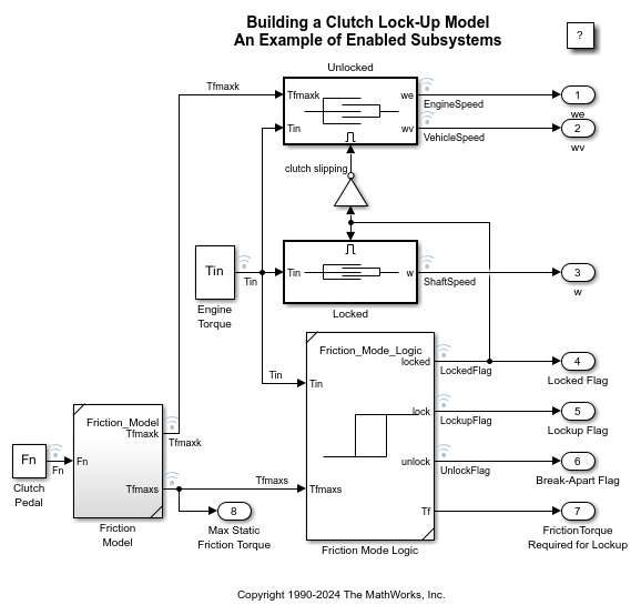 The sldemo_clutch example model that ships with Simulink provides a good introduction to model coverage. This model contains several blocks that have intrinsic decisions, places where control flow can take more than one path.