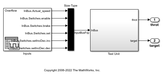 The slvnvdemo_saturation_on_overflow_coverage model contains three Sum blocks configured to saturate on integer overflow. This model uses a test harness that supplies the Test Unit subsystem with a set of inputs that results in full saturation on integer overflow coverage on one Sum block and incomplete coverage on the other two.