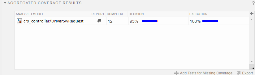 When the test finishes, navigate to the test case results in the Test Manager. The Aggregated Coverage Results section displays the coverage for the analyzed model.