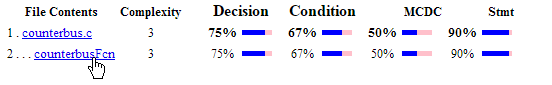 The condition, decision or MCDC outcomes that were not tested during simulation are highlighted in pink. Within the details for a file or function, scroll down to note these cases and investigate them further.