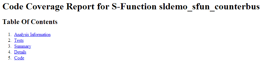 To view the full code coverage report used in this example, follow the steps in Coverage for S-Functions.