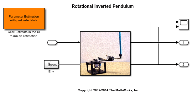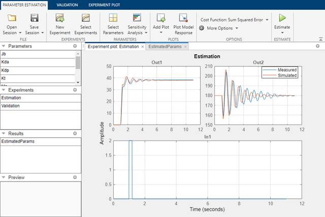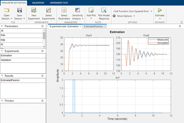Double-click the orange block in the upper left corner of the inverted pendulum model to launch the Parameter Estimator, pre-loaded with data for this project. This is configured with measured experiment data Estimation. For other uses you can import experimental data sets from various sources including MATLAB® variables, MAT files, Excel® files, or comma-separated-value files. It is also configured with validation data Validation which we will use later, after estimation. The measured data in Estimation is shown in the experiment plot. There is only one data set used for estimation in this example.