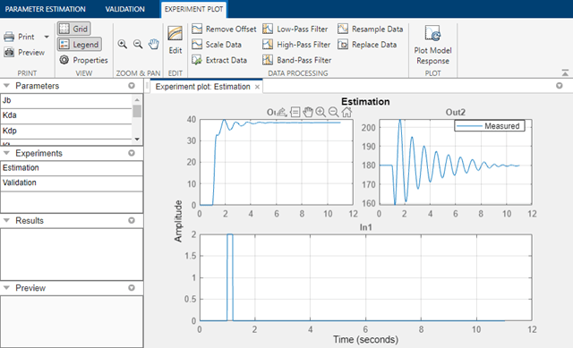 The experiment plot is also used to see how well the measured data matches the current model. Click Plot Model Response in the Parameter Estimation tab to display simulated signal data on the experiment plots. The simulation does not match the measured data, showing that the model parameters need to be estimated.