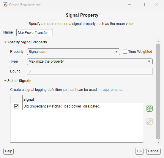 In the Create Requirement dialog box, rename the requirement as MaxPowerTransfer. In the Specify Signal Property area, in the Property drop-down list, select Signal sum, and in the Type drop-down list, select Maximize the property.