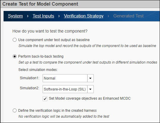 To compare the results of running the component in two different simulation modes, select Perform back-to-back testing on the Verification Strategy tab of the wizard. For SIL testing an atomic subsystem or a reusable library subsystem, the subsystem or library that contains the subsystem must already have generated code. See Enhanced MCDC Coverage in Simulink Design Verifier for more information.