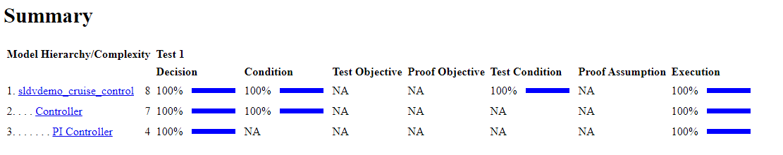 The coverage report indicates that 100% coverage is achieved by simulating all the test cases for sldvdemo_cruise_control_model.