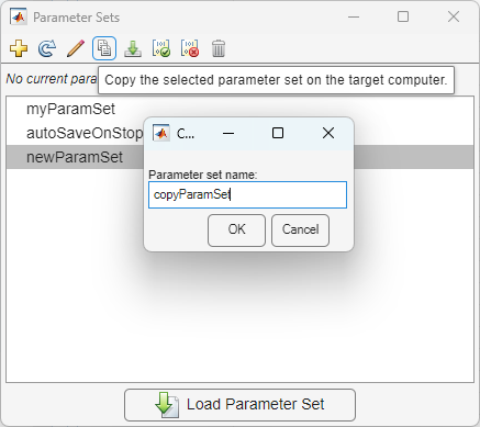 creates a real-time application parameter set button for an instrument panel hParameterSetButton = slrealtime.ui.control.ParameterSetButton(hFigure)uifigure figure. This button opens a UI for working with parameter sets for a