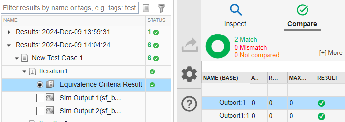 Expand the Results > New Test Case 1 > Iteration1 and select Equivalence Criteria Result. Then, in the Compare tab of the embedded Simulation Data Inspector, select the Outport:1 signal.