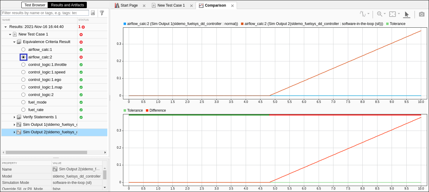 Observe that only one signal failed: airflow_calc. Consider changing the Device details from 32 bits to 64 bits from Hardware and Implementation pane after clicking on Model Settings from Simulation tab, if you are not able to see the failure.