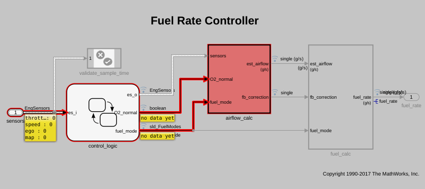 2. Log the output by the signals coming out of airflow_calc and fuel_calc subsystems and the Stateflow chart control_logic to generate a visualization after the analysis. To log signals, click the signal and, in the action bar, click Log Selected Signal.