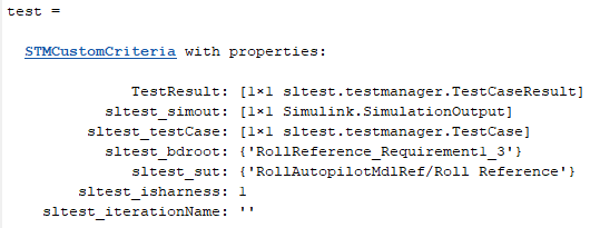 6. Enter test at the command prompt to display the properties of the STMCustomCriteria object. The properties contain characteristics and simulation data output of the test case.
