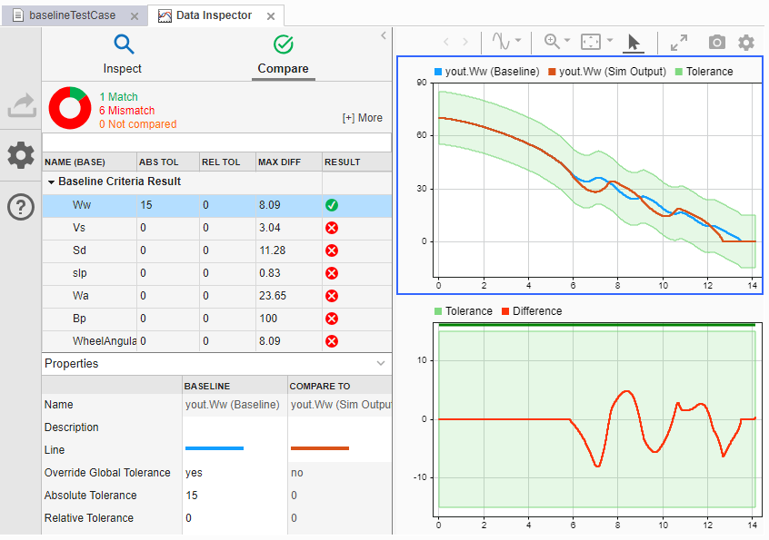 1. In the Test Manager, in the left pane, select Test Browser, then select the baselineTestCase test case. In the right pane, expand the Baseline Criteria section. Set the absolute tolerance of the Ww signal by setting the value in the Abs Tol column to 15. For more information, see Set Signal Tolerances