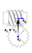 • The cross product of the follower frame z-axis with the base frame z-axis must be a vector aimed from the follower frame origin to the base frame z-axis. The z-axes and their cross-product vector are shown in the figure. The cross product is defined as z^F×z^B.