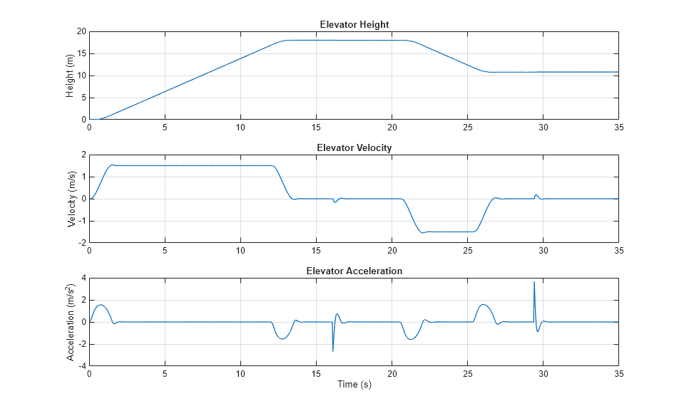 This example models an elevator system in Simscape™ Multibody™. The system is comprised of belt-cable pulley circuits which control the movement of the elevator and the door mechanism. The cable is approximated to be extensible by using high stiffness springs between the belt cable ends and the elevator. The motor pulley is motion actuated based on the necessary elevator kinematics computed from the Floor Number inputs. Effects of people entering and leaving the elevator are modeled using general variable mass blocks.
