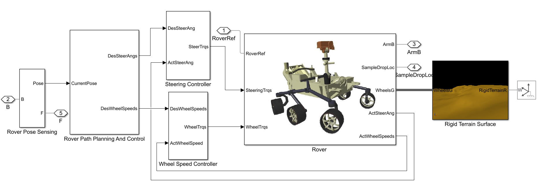 This subsystem models the rover, rigid terrain surface and the path planning and controls aspects of the system.