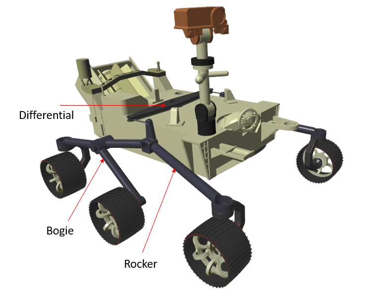 The rover's actuators correspond to the six torque-actuated revolute joints mounted to each of the six wheels for speed control and the four torque-actuated revolute joints mounted to the top of four corner wheels used for steering. In addition to this, three main components of the suspension mechanism are also modeled, namely the differential arm, rocker and bogie.