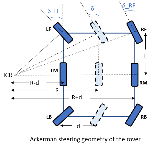 Based on the computed bicycle steering angle () and the turn radius of the rover(), we then obtain the individual steering angles () using the Ackerman steering geometry.[3]