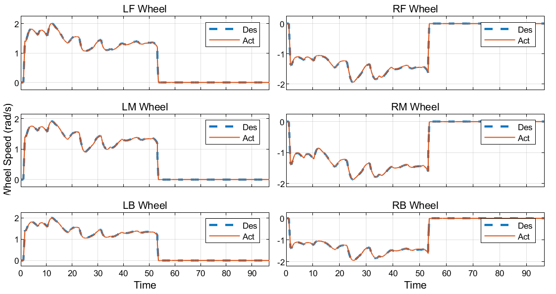 Once both the steering angles and the wheel speeds are formulated for the desired path and the desired chassis linear velocity, a PID controller is used to drive the actual steering angles and the angular rates of the actuators (revolute joints) to their desired values.