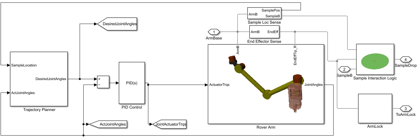KinematicsSolver(requires a Simscape Multibody license) and Trapezoidal Velocity Profile Trajectory (Robotics System Toolbox) (requires a Robotics System Toolbox license) for joint space trajectory planning and control of the rover arm.Joint mode configuration (requires a Simscape Multibody license) for modeling the interaction between the end effector and the sample. For more information about the mode configuration, see the Mode Configuration section of the Revolute Joint block.