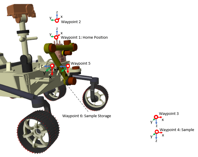To plan the trajectory of the end effector, six waypoints are defined in the task space as shown above. Four of these waypoints (1,2 5 and 6) are precomputed and derived from the geometry of the rover chassis and the location of the storage unit. These can be loaded from roverArmTaskSpaceConfig.mat. Waypoints 3 and 4 are computed based on the sample position obtained from the transform sensor block. Using these six waypoints, the trajectory of the end effector is planned via a joint space trajectory planning approach. The planner first converts all the six task space waypoints to joint space waypoints using the inverse kinematics module (refer to sm_mars_rover_arm_ik.m implemented using KinematicsSolver). These joint space waypoints are then used by a MATLAB function block Task Scheduler to advance the arm through the series of modes as shown above. The scheduler advances the end effector to the next mode when it reaches a target position within some tolerance value. Each task from the scheduler is an input to the Trapezoidal Velocity Profile Trajectory (Robotics System Toolbox) block, which computes a smooth trajectory between each waypoint in the joint space.