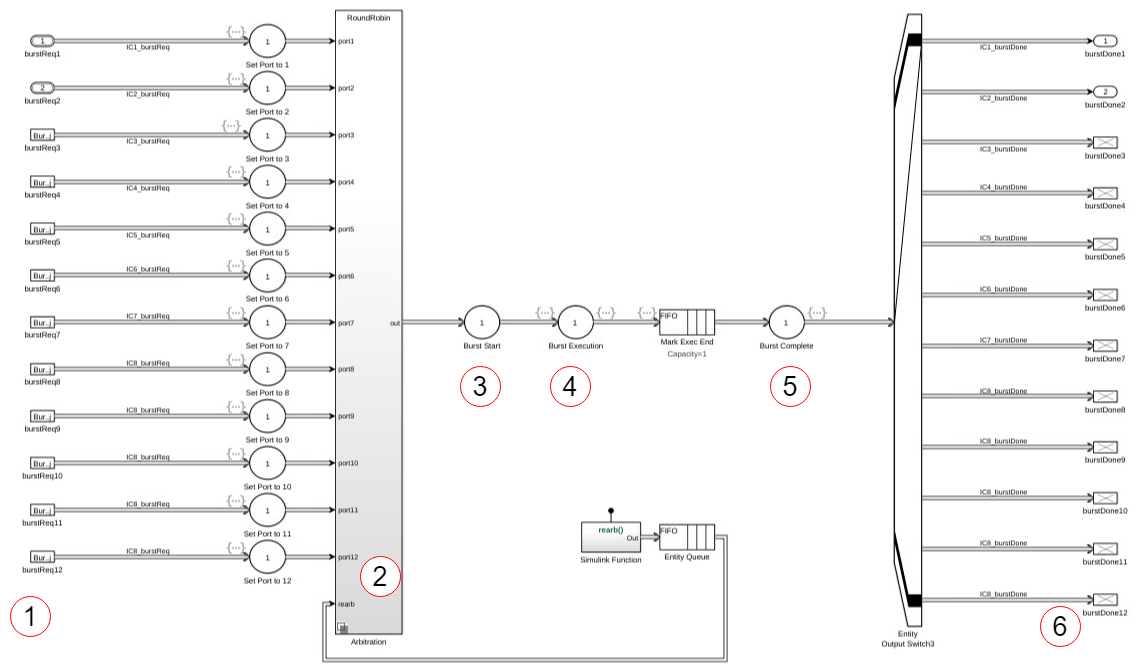 The number of burstDoneN output ports is defined by the Number of masters parameter. burstDoneN represents the Nth input port
