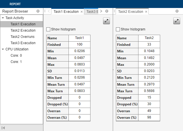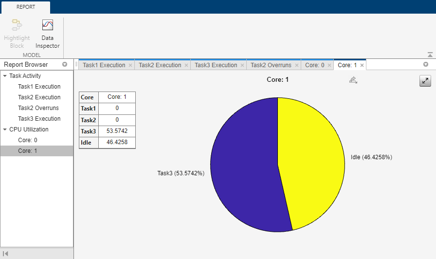 The Performance Report app displays summaries of task executions, core usage of the processor, and memory performance diagnostics. You can use the report after model simulation or after execution on a hardware processor.