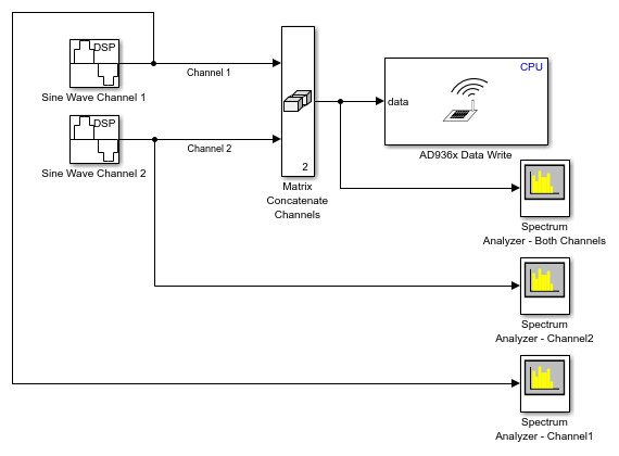 This model is set up to transmit data on two channels. To transmit data on multiple channels, select Enable Channel 1 and Enable Channel 2 in the AD936x Transmitter block mask. Deselect the Enable output port for underflow indicator parameter. The Sine Wave Channel 1 block is configured to generate an 8 kHz sine wave. The Sine Wave Channel 2 block is configured to generate a 1 kHz sine wave. Both sine waves are sampled at 1 MHz. When you run this model, the AD936x Transmitter block sends the generated and combined sine waves through the air. You can inspect the generated data in the Spectrum Analyzer blocks.