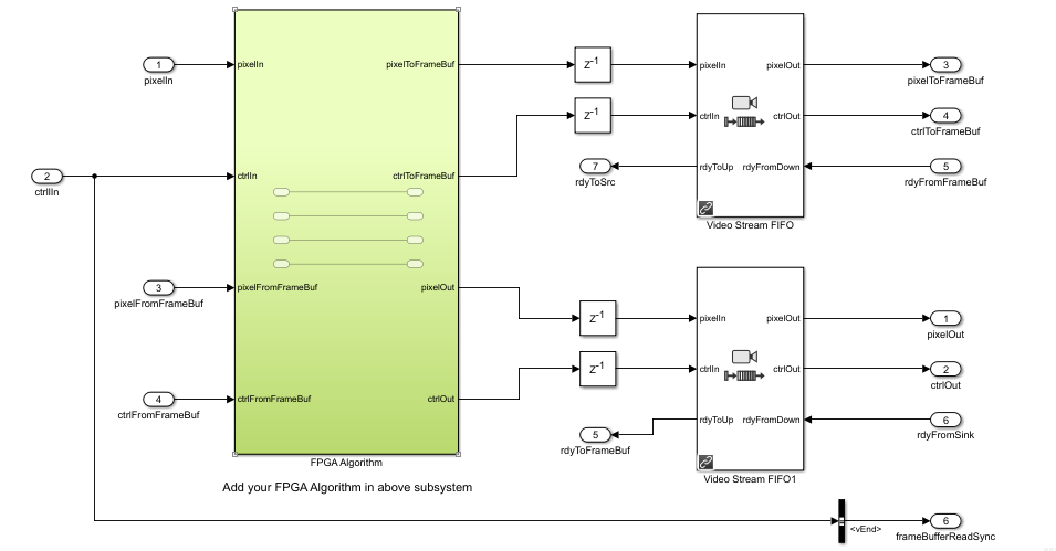 The FPGA pixel model uses Video Stream Connector blocks to connect different subsystems and to connect to HDMI I/O blocks. This is required to be able to generate each subsystem as a separate IP in the implemented reference design from the model. Since the FPGA frame model is for simulation purposes only and is not used for implementation, the Video Stream Connector blocks are not modeled.