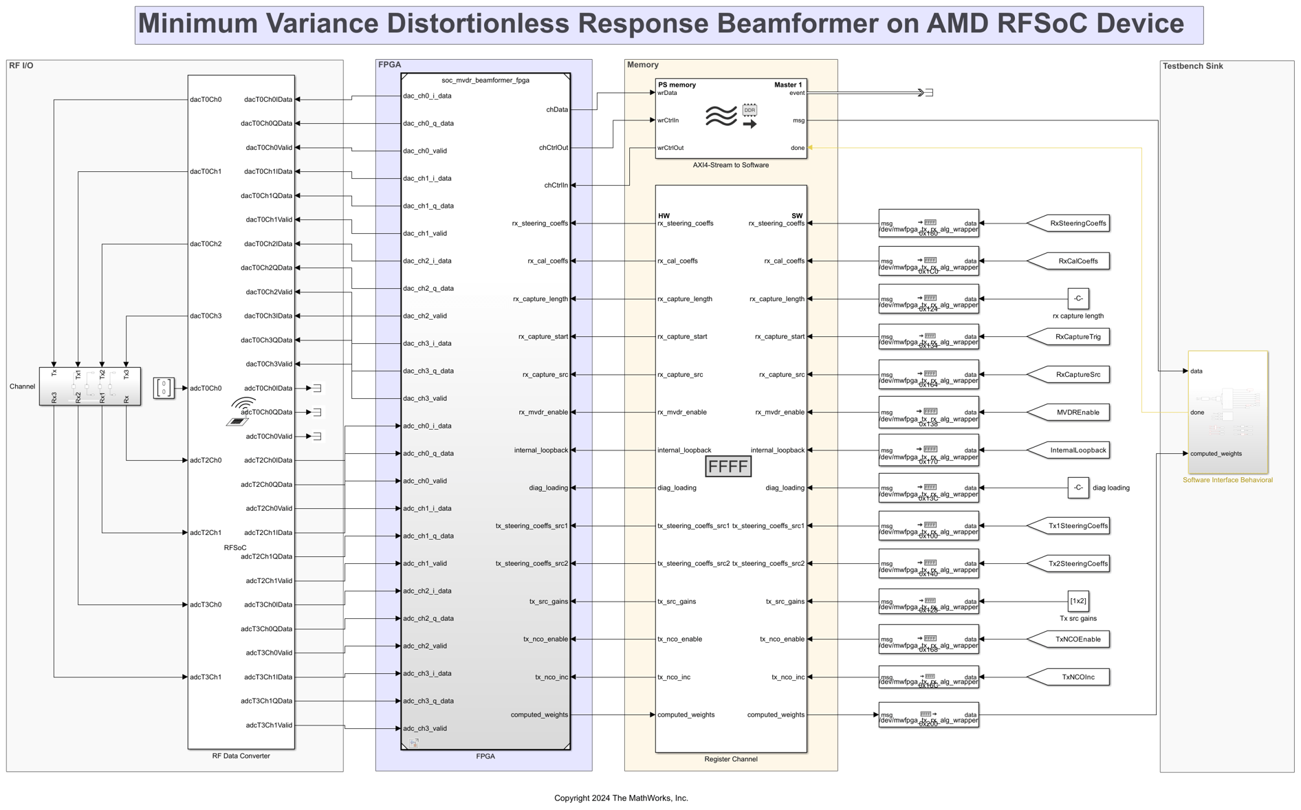 • soc_mvdr_beamformer_zcu111_top.slx, soc_mvdr_beamformer_zcu216_top.slx, and soc_mvdr_beamformer_zcu208_top.slx: Top-level SoC implementation of the example for the ZCU111, ZCU216, and ZCU208 evaluation kits, respectively. The model integrates the FPGA model, soc_mvdr_beamformer_fpga.slx, to the RF data converter and AXI-Stream and AXI-Lite interfaces.