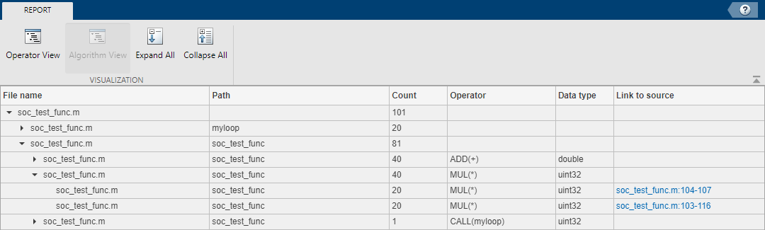 View the generated report in the operator view. On the report toolstrip, click Operator View. Then, when clicking Collapse All each line represents the number of operator executions per data type. A line in the collapsed-view of the report represents one or more operators, with the same data-type. Expand a line to see the individual operators contributing to the count, their path in the model hierarchy, and a link to their location in the model.