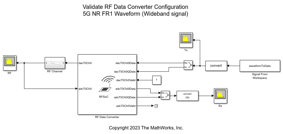 This example shows how to validate an RF data converter (RFDC) configuration in a simulation. An RFDC has several interdependent parameters that you can configure. Fine-tuning these parameters is difficult when the design runs on hardware. In this example, you simulate the RF Data Converter block with two different configurations. One configuration shows the response of a tone and the other shows the response of a 5G NR FR1 waveform. You can also observe the RFDC configuration effects and modify the RFDC configuration to receive and transmit the waveform without any distortion.
