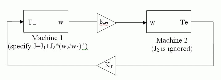 The next figure indicates how to model a stiff shaft interconnection in a motor-generator. The speed output of machine 1 (motor) is connected to the speed input of machine 2 (generator), while machine 2 electromagnetic torque output Te is applied to the mechanical load torque input TL of machine 1. The Kw factor takes into account speed units of both machines (rad/s) and gear box ratio. The KT factor takes into account torque units of both machines (N.m) and machine ratings. Also, as the inertia J2 is ignored in machine 2, J2 referred to machine 1 speed must be added to machine 1 inertia J1.
