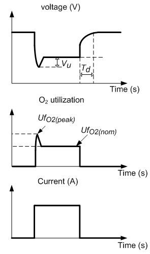 Current step and interrupt tests must be made on a real stack to represent with accuracy its dynamics. The figure below shows the stack response from these tests and the required parameters (Td, UfO2(peak) and Vu).