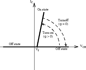 The IGBT turns on when the collector-emitter voltage is positive and greater than Vf and a positive signal is applied at the gate input (g > 0). It turns off when the collector-emitter voltage is positive and a 0 signal is applied at the gate input (g = 0).