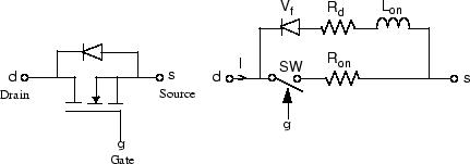 With a positive or negative current flowing through the device, the MOSFET turns off when the gate input becomes 0. If the current I is negative and flowing in the internal diode (no gate signal or g = 0), the switch turns off when the current I becomes 0.