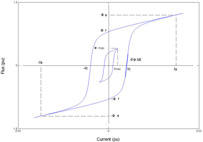 The hysteresis model is based on a semi-empirical characteristic, using an arctangent analytical expression Φ(I) and its inverse I(Φ) to represent the operating point trajectories. The analytical expression parameters are obtained by curve fitting empirical data defining the major loop and the single-valued saturation characteristic. The Hysteresis design tool of the Powergui block is used to fit the hysteresis major loop of a particular core type to basic parameters. These parameters are defined by the remanent flux (Φr), the coercive current (Ic), and the slope (dΦ/dI) at (0, Ic) point as shown in the next figure.