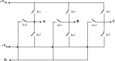 The type of power switching device (IGBT, GTO, MOSFET, or ideal switch) and the number of arms (one, two, or three) are selectable from the dialog box. When the ideal switch is used as the switching device, the Three-Level Bridge block implements an ideal switch bridge having a three-level topology as shown in the following figure.