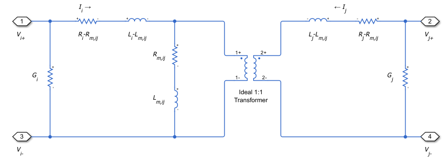 The equivalent circuit shows the coupling between two arbitrary phases i, and j. The block models the magnetic coupling using such an equivalent circuit between each of the three phases a, b, and c.