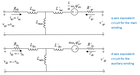 The single phase induction machine consists of a squirrel cage rotor and two stator windings, the main and the auxiliary windings. The auxiliary winding is typically only active during startup. However, to improve performance, the auxiliary winding can be active during running for low-power applications. The figure shows the equivalent d- and q-axis circuits for the main and auxiliary windings.