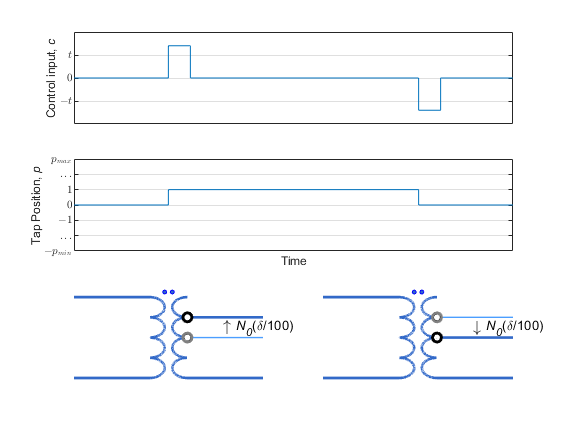 Use the control input c to change the tap position of the transformer.