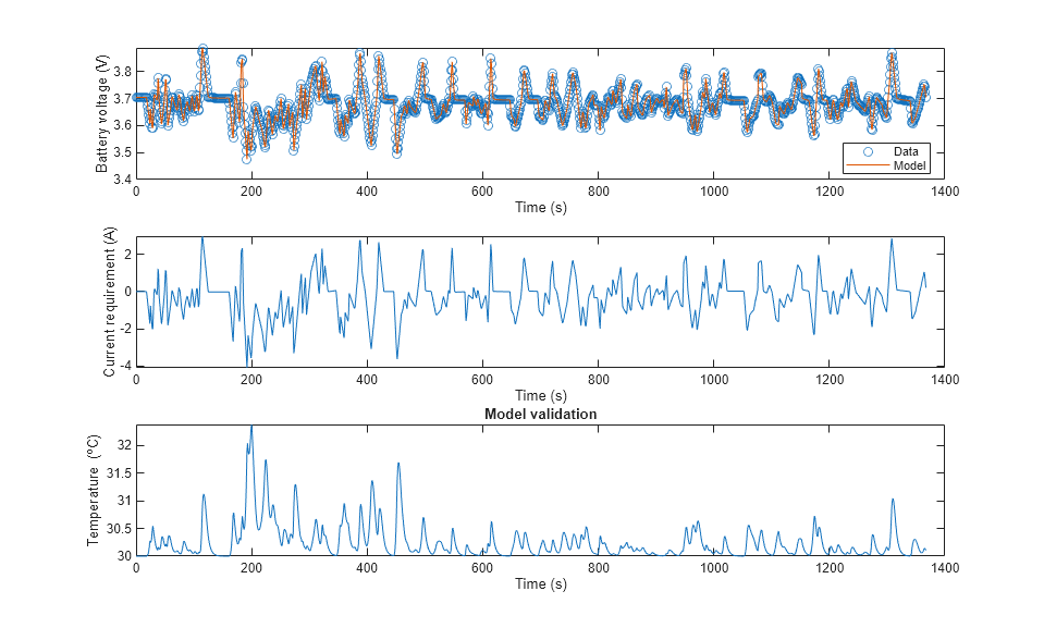 The MATLAB data file, BatteryParameterizationData.mat, stores Battery data as an array of structures. Each structure contains 5 fields: v (voltage), i (current), t (time), SOC0 (initial state of charge) and T (temperature). Scope save the output voltage as structure data, out.Vo.signals.values.