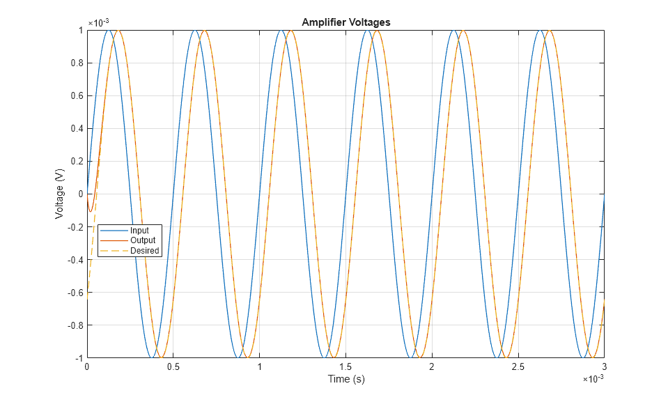 The plot below shows the input and output voltages of the phase shifting filter. The gain is 1, and the output signal is offset by the specified phase.