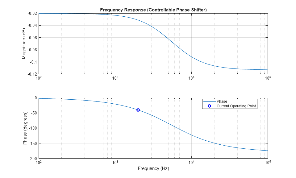 The plot below shows frequency response of the phase shifting filter. The specified operating condition is shown on the frequency response plot.