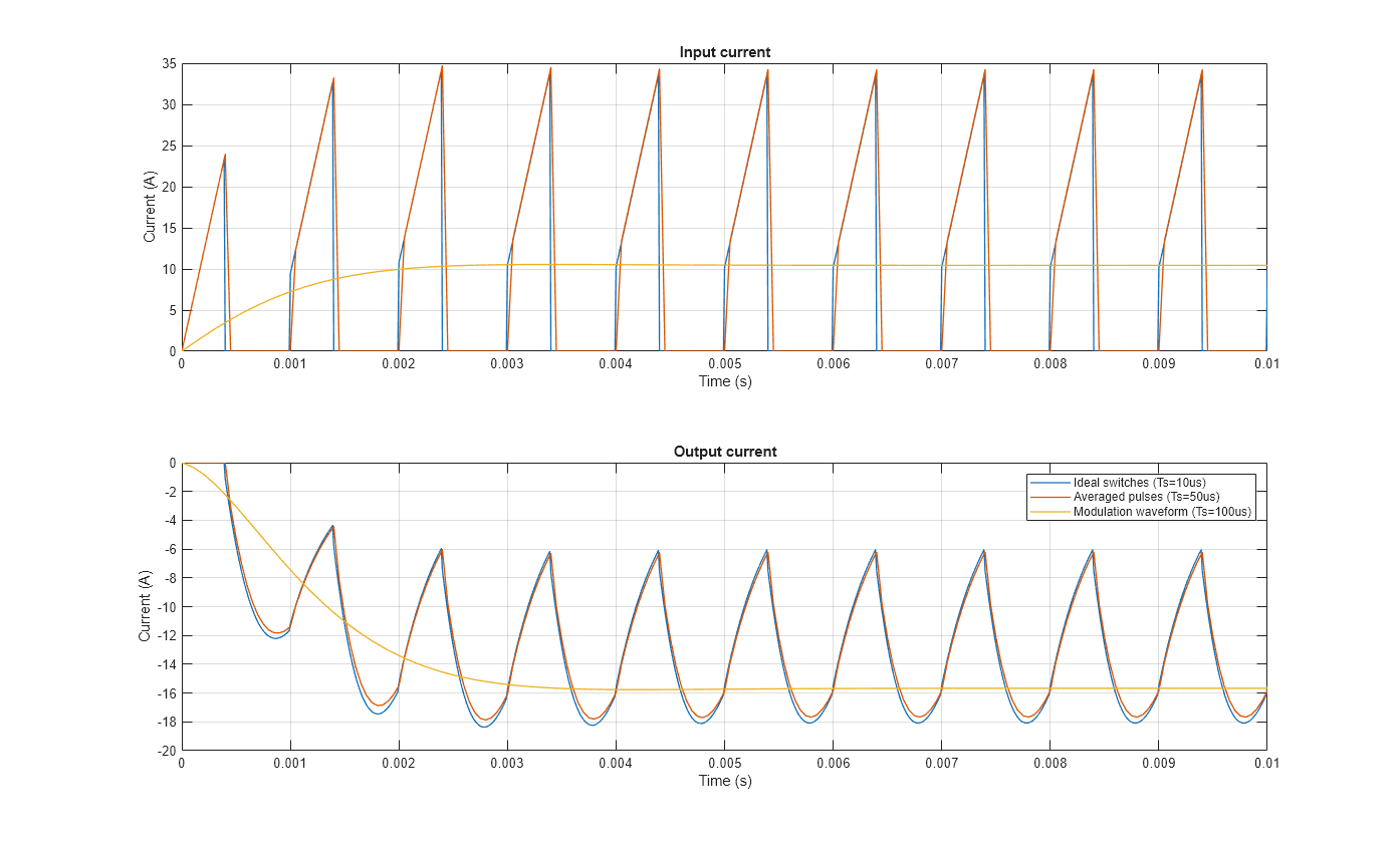 This example shows how to use different levels of fidelity in DC-DC converters. The system contains three buck-boost converters. The top converter uses an ideal switch at a sample time of 10 us. To yield accurate results even though the model is under sampled at a sample time of 50 us, the middle converter uses an averaged switch with averaged pulse. To further increase the sample rate and to operate as an ideal averaged converter, the bottom converter uses an averaged switch and duty cycle instead of gate pulse. The Control subsystem contains a PWM generator. The Scopes subsystem contains Scope blocks that allow you to see the simulation results.