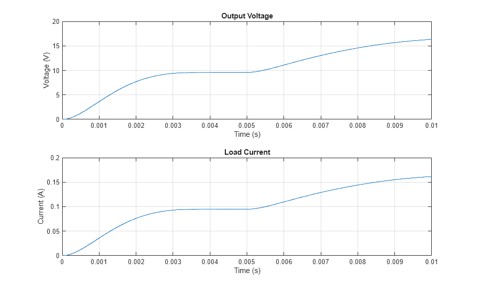 The plot below shows the requested and measured output voltage for the test and the load current in the circuit.