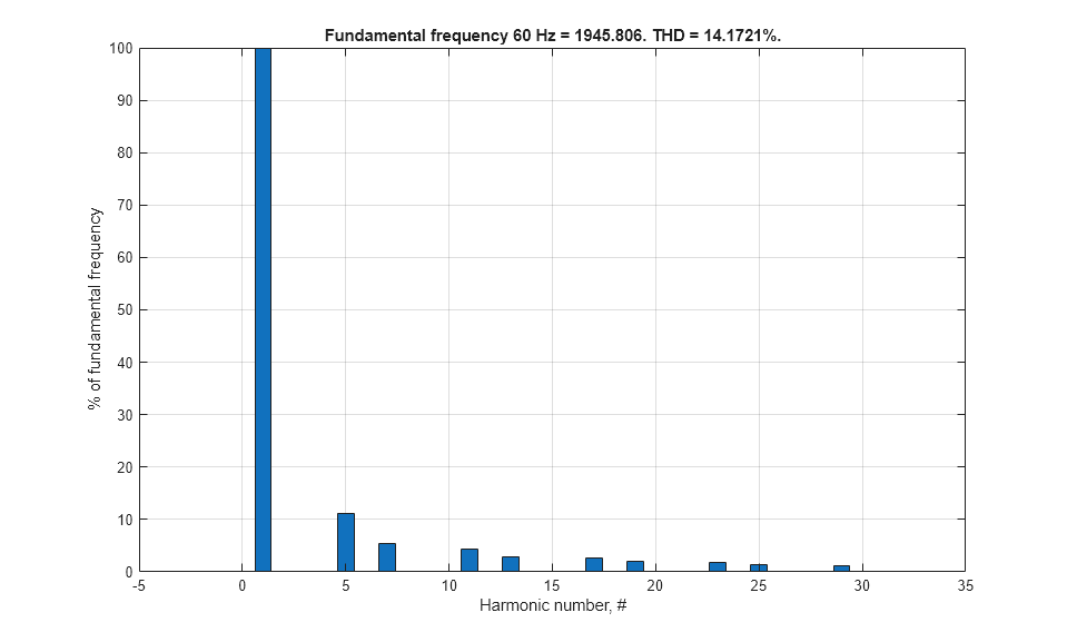 This example shows how to use three functions which are callable from the MATLAB command line. The functions analyze Simscape logging data to get harmonic magnitudes, calculate total harmonic distortion percentage and plot harmonic magnitudes.