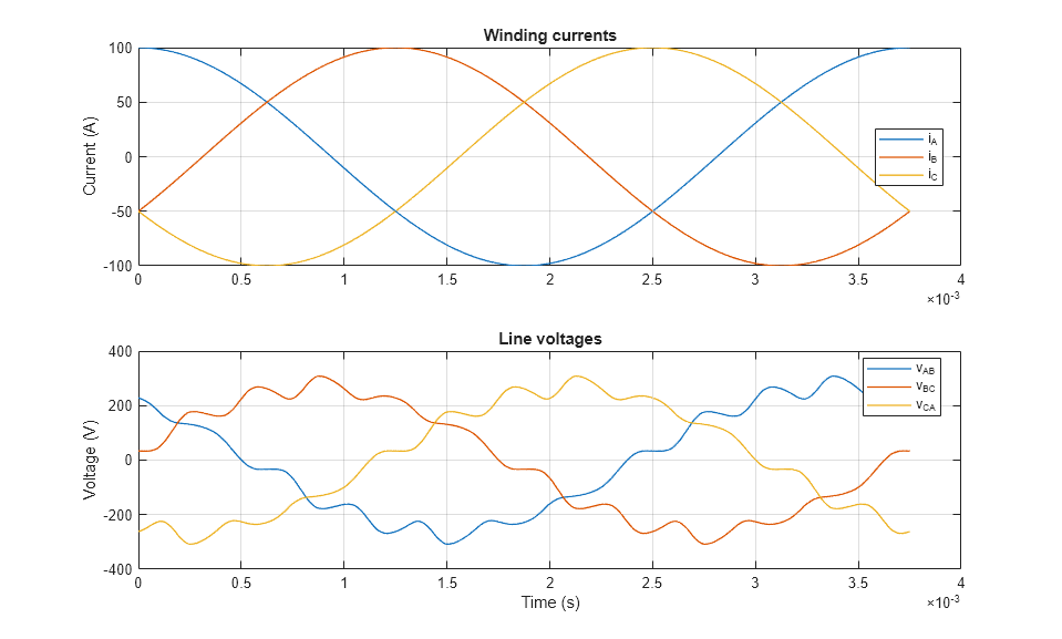 This plot shows the sinusoidal currents and the resulting line-to-line voltages. The flux dependence on the rotor angle results in the presence of the higher-order harmonics.