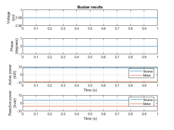 This plot shows the simulation results following the steady state initialization to meet load flow targets. Observe that there is no transient, indicating that the induction motor has been correctly initialized.