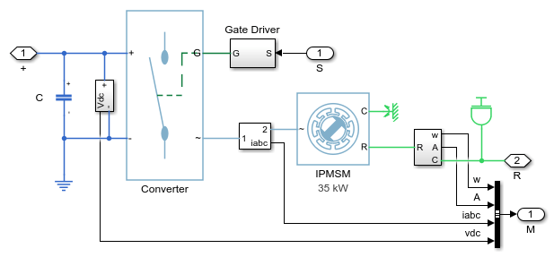 This example shows a simplified parallel hybrid electric vehicle (HEV). An interior permanent magnet synchronous machine (IPMSM) and an internal combustion engine (ICE) provide the vehicle propulsion. The IPMSM operates in both motoring and generating modes. The vehicle transmission and differential are implemented using a fixed-ratio gear-reduction model. The Vehicle Controller subsystem converts the driver inputs into torque commands. The vehicle control strategy is implemented as a Stateflow® state machine. The ICE Controller subsystem controls the torque of the combustion engine. The Drive Controller subsystem controls the torque of the IPMSM. The Scopes subsystem contains scopes that allow you to see the simulation results.